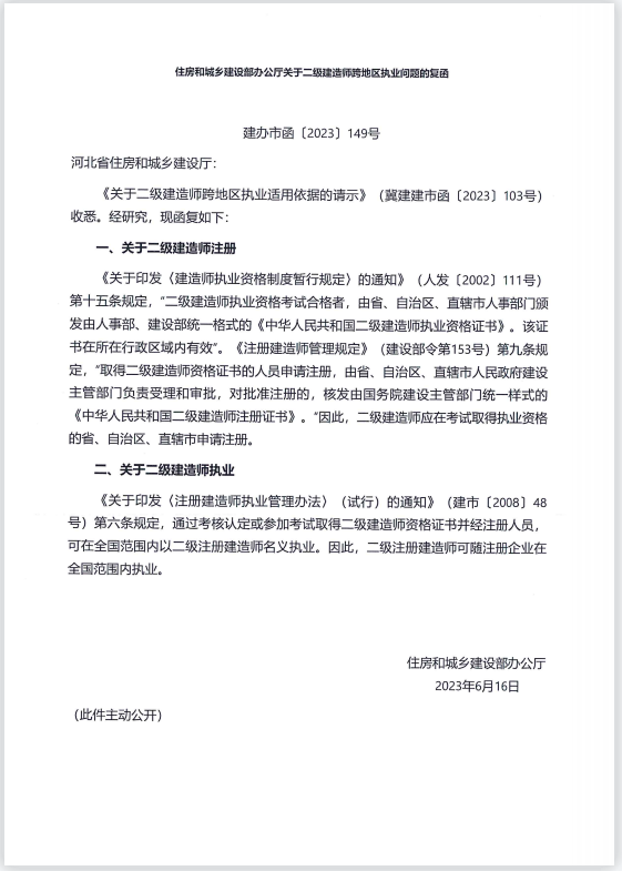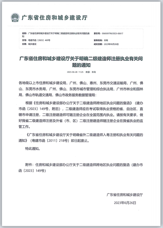 广东省住房和城乡建设厅关于明确二级建造师注册执业有关问题的通知(粤建市函〔2023〕469号)